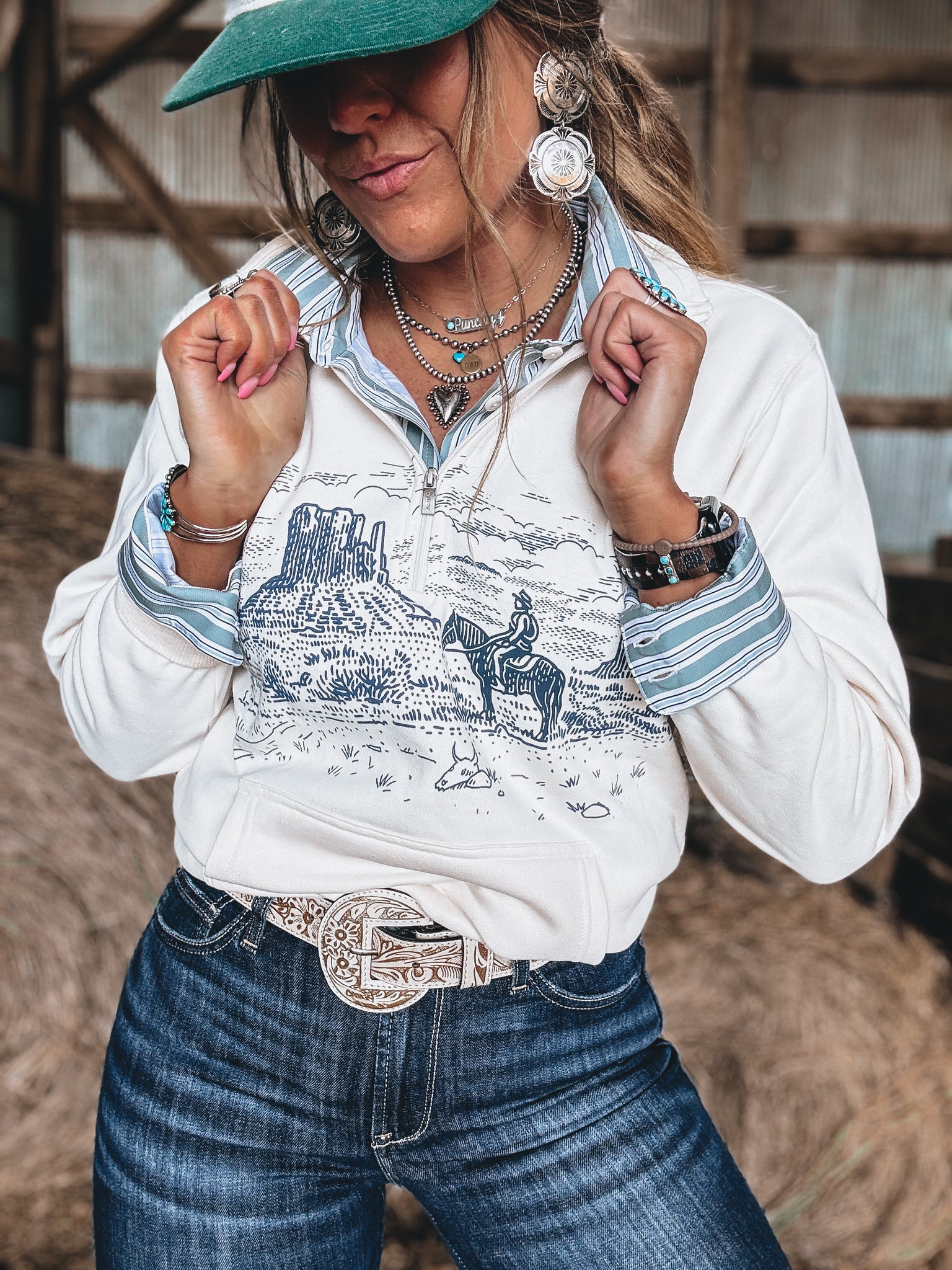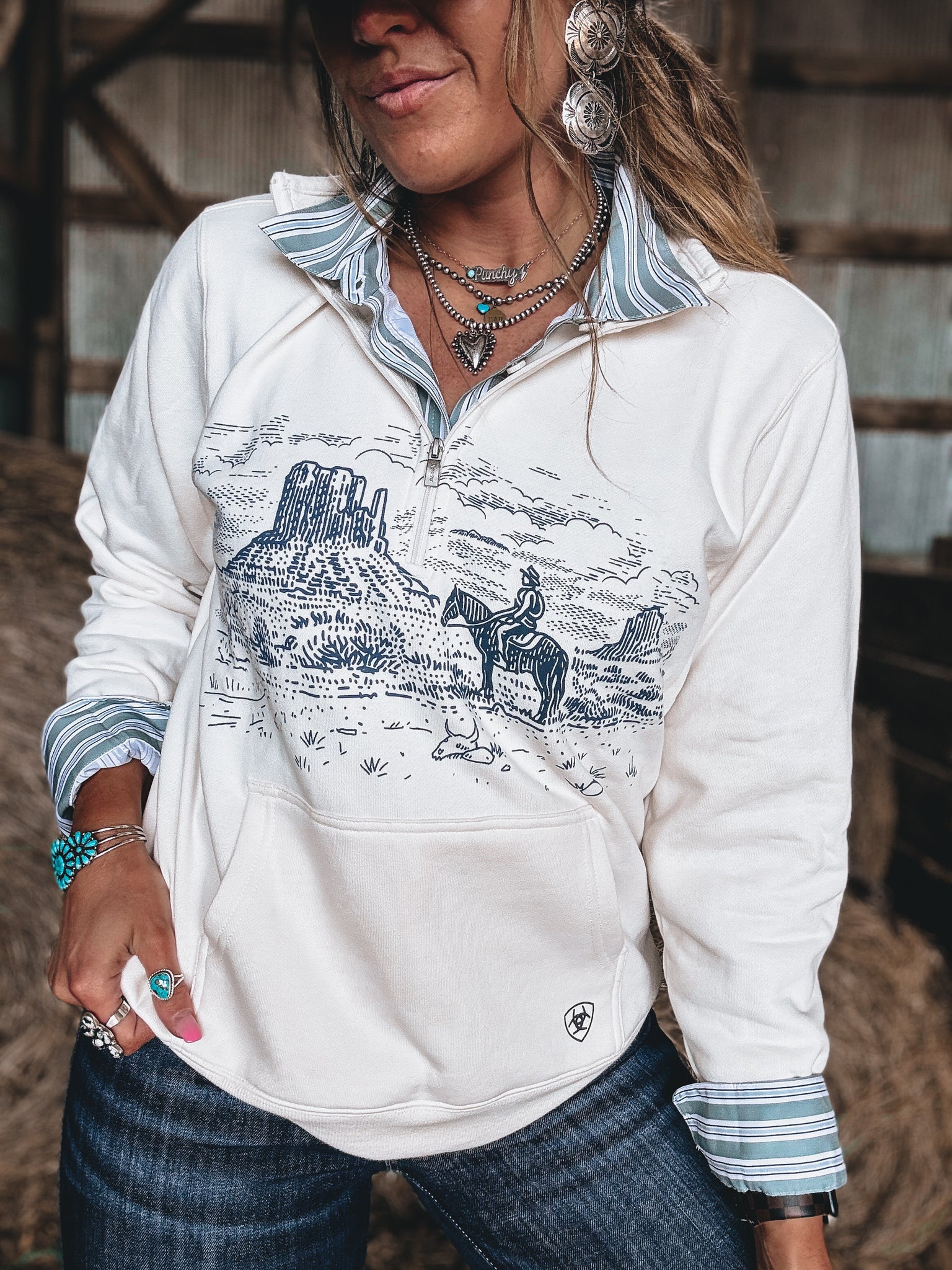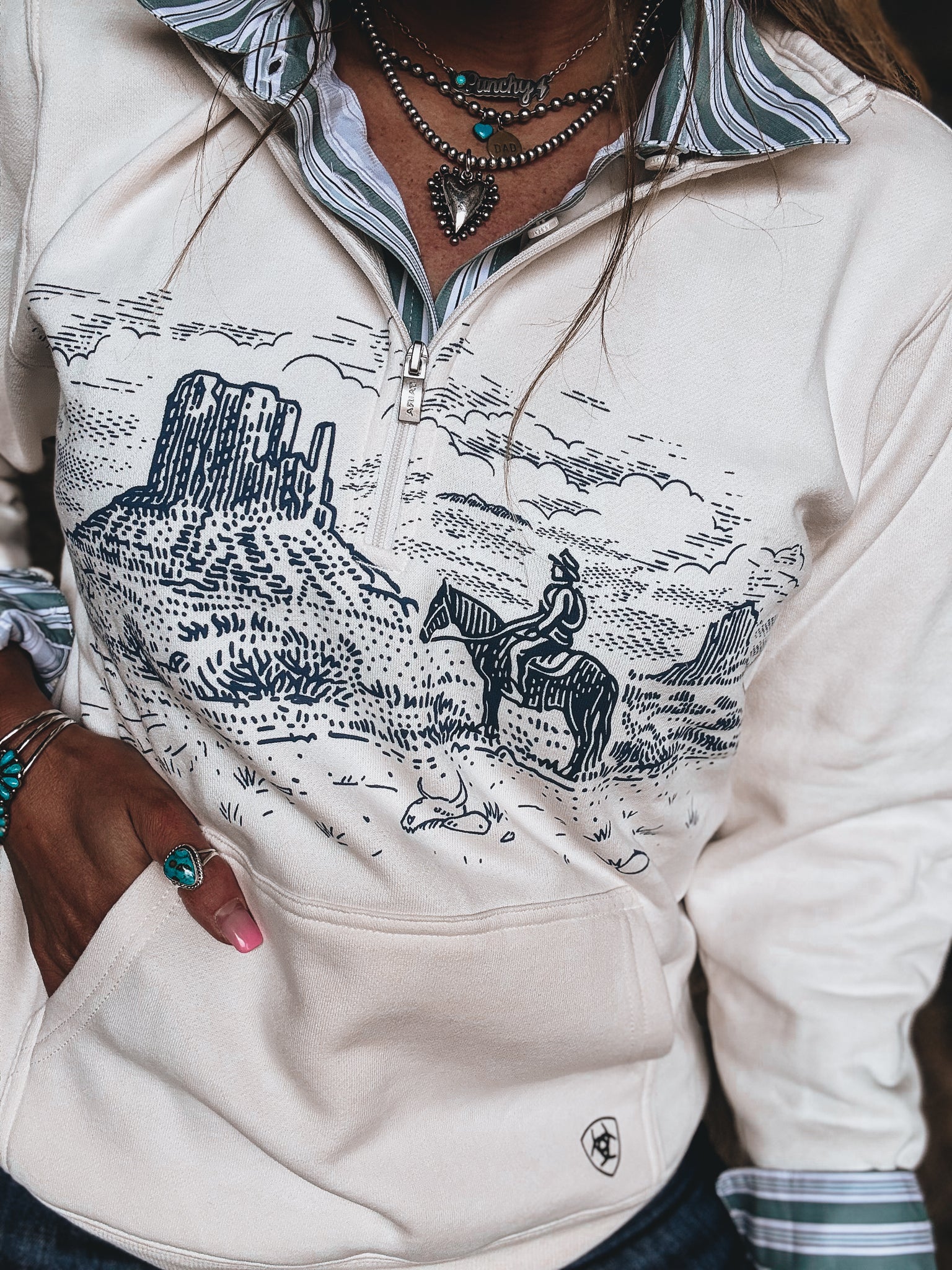 Whether you're doing a morning grocery run or making s'mores around the campfire, this comfy-cute layer will keep you cozy. The zippered collar adds warmth and versatility, while the idyllic Western landscape print brings Western style.