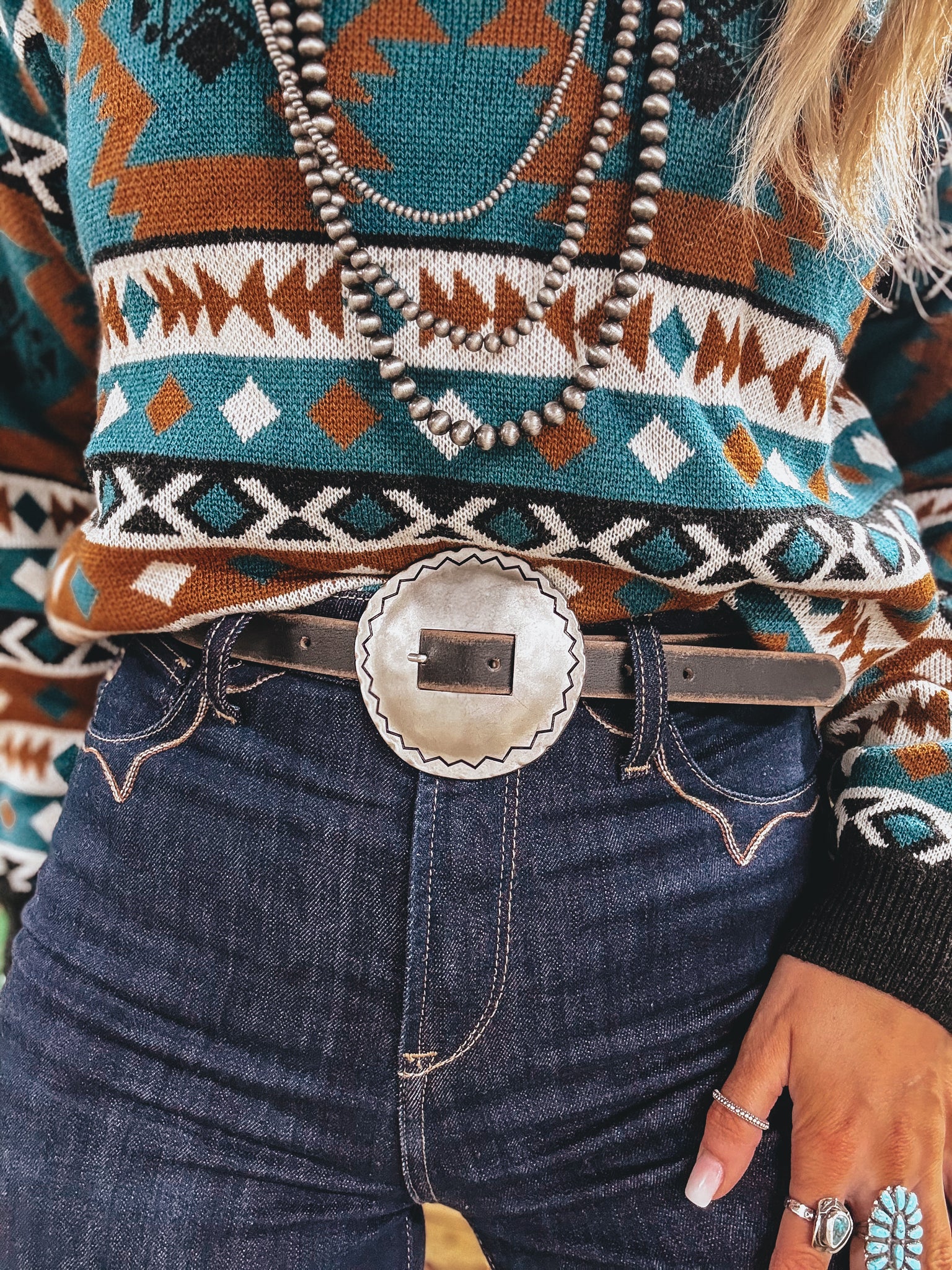 Model wears size 26"/27" high waisted denim in a size S/M belt, but would prefer a size M/L if wearing midrise denim.